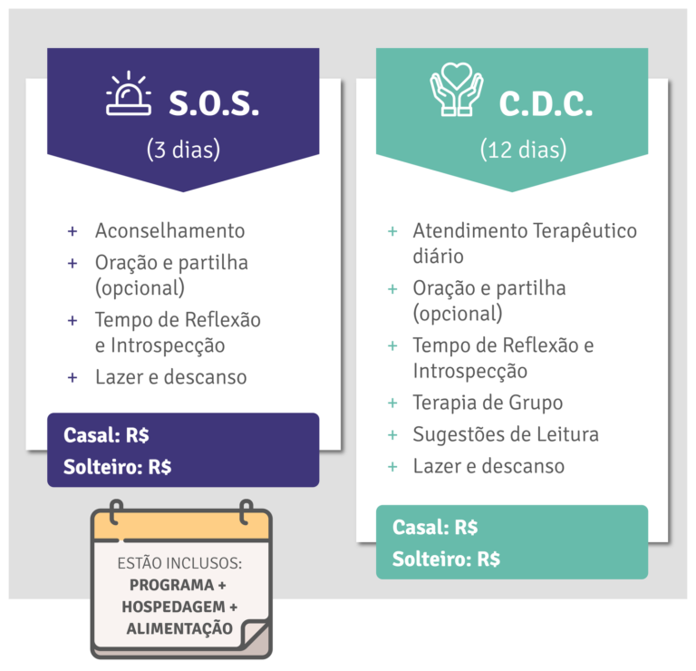 S.O.S: Um período de 3 dias onde será oferecido acolhimento e descanso, com o intuito do participante realinhar os objetivos da vida e reconectar consigo mesmo, com o outro, como também com a Criação.